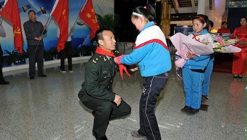 孩子們為英雄航天員費俊龍將軍佩戴紅領巾