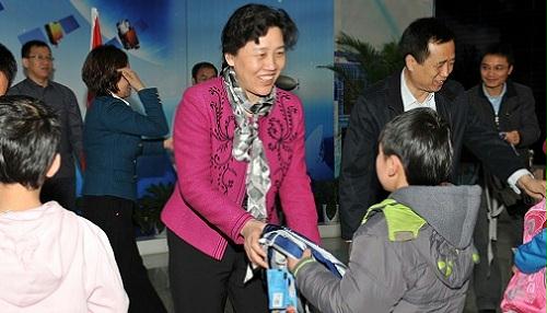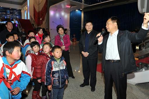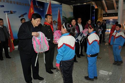 來到北京航天城 在航天城會展中心展廳,孩子們第一次見到了從前只能在電視里見到的英雄航天員費俊龍。當費將軍走進展廳時,孩子們歡呼雀躍,激動的心情寫在紅撲撲的小臉上。孩子們為英雄航天員敬獻紅領巾和莊嚴的少先隊隊禮,以表達他們對航天員叔叔崇高的敬意和無限的敬仰之情。費將軍與孩子們親切握手,鼓勵孩子們要熱愛黨、熱愛人民、熱愛偉大的祖國,要勇敢、堅強,不怕困難,超越自我,珍惜現在的學習條件和所有人的關心幫助,努力學習,真正成為中國特色社會主義事業的合格建設者和接班人!他在講話中表示,通過這次活動能夠為孩子們獻上自己的愛心,積極履行社會責任,非常有意義。費將軍還和國資委直屬機關黨委常務副書記曾堅、企業改革局局長白英姿、直屬機關工會主席呂秋菊以及中國航天科技集團公司五院黨委書記李開民一起,把嶄新的學習用品送到孩子們手中。