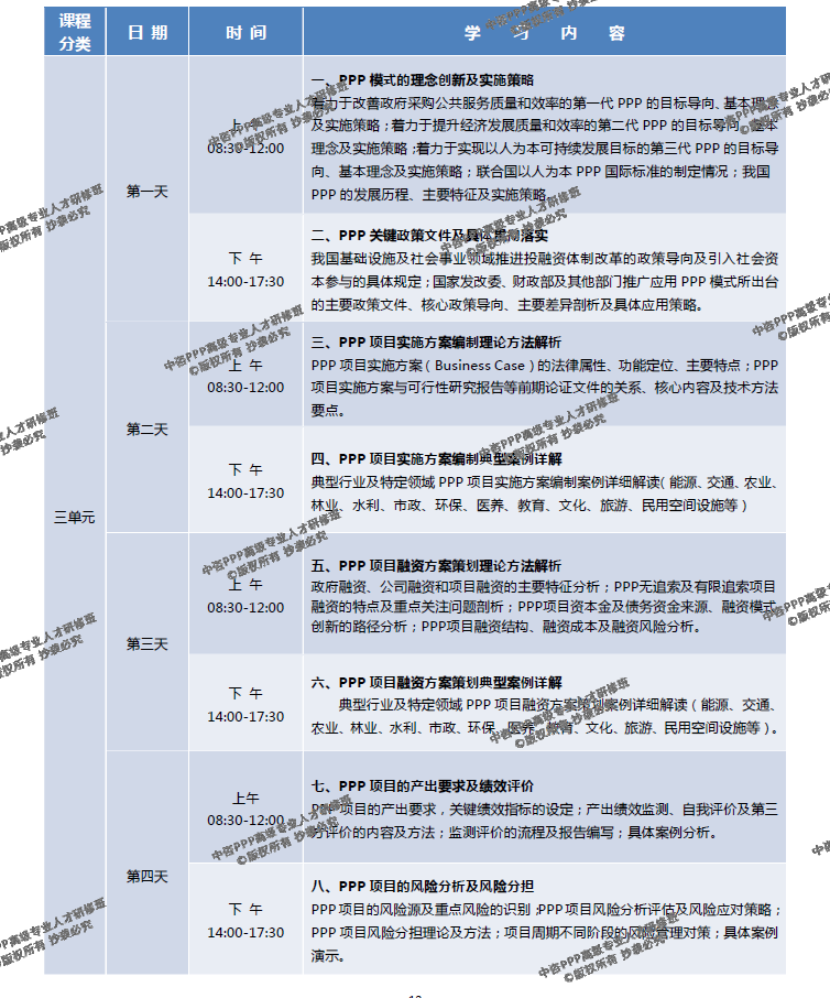 1、專家組在廣泛調研和全面總結2014年以來全國各地開展的大量PPP專題培訓具體經驗及存在問題的基礎上,充分考慮我國PPP項目運作的實際特點、從業人員所接觸的PPP知識結構現狀及未來引導PPP模式健康發展的實際需要,通過系統論證和充分研討,最終確定包括24個專題共108個學時的“中咨PPP高級人才研修課程體系”。 2、希望通過三個單元共12天的系統性高強度集中學習,糾正過去培訓所傳導的對PPP的各種錯誤理解,甄別當前PPP相關政策文件的核心精神及主要缺陷,重新梳理我國今后推動PPP模式健康發展的核心理念,全面掌握PPP項目實施方案編制、融資方案策劃、產出績效評價、風險分析及規避策略、招投標及政府采購、商務策劃及財務測算、財政資金支付及其可行性評價、合同體系及爭議解決等理論方法及具體案例操作規范,并從深化投融資體制改革及完善PPP項目監管總體框架的角度,理清PPP模式的理念創新及實施策略、制度及法制體系建設、資本市場融資、項目審批核準及備案規范操作、信息公開及社會穩定風險評估、PPP項目管理流程優化、后評價等直接影響PPP模式健康落地的必備知識和技能。 3、課程的設置特別強調體系完整、結構合理、銜接緊湊、實用性強。中國國際工程咨詢公司專家團隊對每一位講師提供的課程講義進行嚴格把關,特別強調按照統一要求對培訓教材進行修改完善,不同講師的講課主題不得簡單重復,講課內容不得出現明顯錯誤,不得與PPP項目的實際操作無關,也不得在課堂上不著邊際隨意發揮,必須充分尊重學員的寶貴時間,確保研修取得滿意效果。 4、考慮到研修班屬于在職人員集中培訓的特點,借鑒類似高端研修課程的成功經驗,充分考慮學員難以長期集中在職培訓的實際困難,將12天的培訓分為3個單元進行,每個單元安排4天時間集中學習,且盡可能利用周末時間。為了確保研修效果,要求所有學員 必須完成全部3個單元共12天的高強度集中培訓課程。