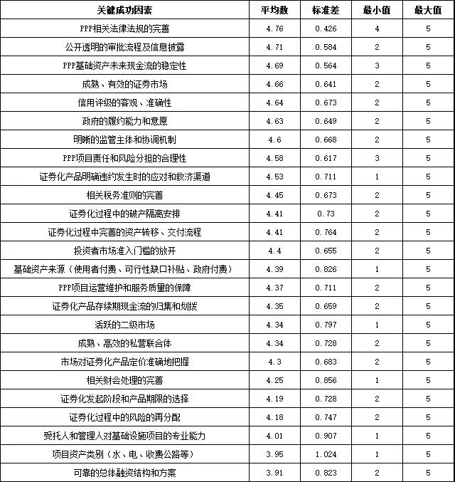 導 讀 2017年4月,上海證券交易所舉行了中國首批PPP項目資產支持證券的掛牌儀式,標志著國家發展改革委、中國證監會聯合推進的傳統基礎設施領域PPP項目資產證券化(ABS)產品正式落地。 受國家發展改革委委托,中國國際工程咨詢有限公司(中咨公司)研究中心承擔了我國首批PPP資產證券化項目的評估以及相關專題的研究工作,其中“政府和社會資本合作項目資產證券化研究”專題成果獲2018年度國家發展改革委優秀研究成果三等獎。本文基于關鍵成功因素(CSF)分析,搭建關于PPP資產證券化融資的可行性評價模型,并在首批PPP資產證券化項目評估實踐中應用驗證,是該專題研究的系列成果之一。由哥倫比亞大學、清華大學、中咨公司等機構專家合作撰寫完成的相關學術論文Assessment Framework for Financing Public-Private Partnership Infrastructure Projects through Asset-Backed Securitization于2019年11月刊載于工程管理領域國際頂級學術期刊《Journal of Management in Engineering》(SCI檢索)第35卷第6期,本文基于原論文由伍迪、陸征翻譯整理,有刪減與修改。近期,恰逢國家發展改革委、中國證監會正在推動基礎設施REITs試點相關工作,基礎設施REITs即以權益型ABS產品穿透取得底層資產的公募基金,希望本文研究內容對相關從業人員及相關政策制訂提供一定參考與借鑒。 摘要:關鍵成功因素(Critical Success Factors,CSF)分析是PPP領域研究與實踐的一個重要分支,其重要意義在于可以為PPP從業者提供更為量化且易于操作的總體評價指標體系。PPP資產證券化能否取得預期效果受多方面因素的影響,為了探索如何成功地通過PPP資產證券化利用資本市場進行融資,有必要對其關鍵成功因素進行深入研究。本文首先綜合使用文獻調研、案例分析、專家訪談等方法,系統識別PPP資產證券化的關鍵成功因素清單,在此基礎上對相關領域專家展開廣泛的問卷調研;然后采用主成分分析法(Principal Component Analysis,PCA)處理調研數據,分析識別主成分與各因素之間的關系,從問卷數據中挖掘出市場認可的、對融資成功與否產生重要影響的幾個關鍵維度;最后基于以上結論搭建關于PPP資產證券化融資的可行性評價模型。 關鍵詞:政府與社會資本合作(PPP);資產證券化(ABS);關鍵成功因素(CSF);基礎設施融資;主成分分析(PCA) 1. PPP資產證券化關鍵成功因素的識別 1.1 基于文獻調研識別關鍵成功因素 在世界范圍內PPP與資產證券化的結合仍屬新生事物,2016年底中國發布專項政策推廣相關工作,國際上針對這一融資創新的理論研究十分有限。因此,本文對PPP關鍵成功因素、基礎設施融資、資產證券化等相關領域分別進行文獻調研,從中篩選并形成適合作為PPP資產證券化關鍵成功因素的初步清單,如表1所示。 表1 基于文獻調研識別的關鍵成功因素 1.2 基于案例分析識別關鍵成功因素 成功案例經驗歸納。以世界范圍內成功PPP項目為分析對象,重點從世界銀行發布的引入私人資本的優質PPP項目中篩選案例,歸納成功經驗,從而完善PPP項目資產證券化關鍵成功因素。案例分析的研究過程可以應用比較分析法來突顯這些成功項目的相似點,而這些相似點則可以作為這些成功項目的重要特征而添加到成功因素清單中。在與世界銀行融資方面相關專家訪談的基礎上,本文選定了來自6個國家的不同成功案例來進行比較分析。通過成功案例經驗歸納發現:政策支持、成熟有效的資本市場、采購過程的透明度、完善的法律框架、合理的項目審批流程、清晰的監管機構與公共部門實施機構、合理的風險分擔機制、實力強大的聯合體、清晰的職能與責任劃分、社會資本的融資能力、項目收費的合理定價、運營階段可靠的服務等是促成PPP項目成功的重要因素。 失敗案例教訓總結。對失敗案例教訓的總結能夠更加全面地了解PPP資產證券化融資的關鍵節點和成功的必要條件。本文選擇的失敗案例包括發生違約或信用評級降低等事件的基礎設施收費收益權類資產證券化案例,包括某大橋通行費收入收益權專項資產管理計劃(違約)、某熱電電力上網收費權債權和供用熱合同債權資產支持專項計劃(降級)等。通過對失敗的基礎設施資產證券化案例教訓總結發現:缺乏差額補償資金來源、提供擔保的機構與被擔保的項目具有強關聯性、產業政策的變化與市場的不確定性、現金流的歸集與分配結構不清晰、違約事件發生后缺乏解決方案等是導致失敗的重要因素。 1.3 基于專家訪談識別關鍵成功因素 在以上研究基礎上,研究團隊在2016年12月至2017年1月期間,對來自于政府監管機構、行業職能部門、機構投資者、金融中介機構、建筑工程公司、咨詢公司、科研機構等不同部門的共計36名資深專家進行專家訪談,以便進一步驗證和補充關鍵成功因素清單。訪談對象不僅來自于PPP資產證券化的各個相關行業,同時兼顧了政府和社會資本方、兼顧了業界從業者和學術界專家。 1.4 PPP資產證券化關鍵成功因素清單 通過文獻調研、案例分析、專家訪談三個步驟互相補充和驗證后,最終形成具有25項關鍵成功因素的清單,如表2所示。本研究將在此清單基礎上設計問卷并分析各因素的關系,為PPP資產證券化可行性分析奠定基礎。 表2 PPP資產證券化關鍵成功因素 2. 基于CSF清單的問卷調研設計與實施 2.1 問卷設計 本研究調研問卷基于以上識別出的關鍵成功因素(CSF)清單(表2)進行設