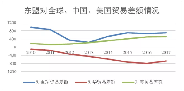 自2010年以來,東盟對華貿易持續逆差。據東盟統計,2010年東盟對華貿易逆差103.6億美元,2015年、2016年和2017年連續三年分別為729.1億美元、803.4億美元和680.6億美元。如果不包括新加坡,逆差額還會進一步擴大,如2017年除新加坡外東盟國家對華貿易逆差總額767.5億美元。
