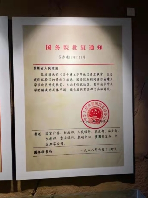 海雀村保留的國務院設立畢節(jié)試驗區(qū)批復件 習近平總書記十分關心畢節(jié)的發(fā)展,2014年5月15日,在《中共貴州省委關于畢節(jié)試驗區(qū)建設發(fā)展情況的報告》上作出重要批示,要求“進一步深化改革,銳意創(chuàng)新,埋頭苦干,同心攻堅,努力實現(xiàn)人口、經濟與資源環(huán)境協(xié)調發(fā)展,為貧困地區(qū)全面建成小康社會闖出一條新路子,在多黨合作服務改革發(fā)展實踐中探索新經驗”。 2018年7月18日,在試驗區(qū)建立30周年之際,習近平總書記再次作出重要批示,強調“要盡銳出戰(zhàn)、務求精準,確保畢節(jié)試驗區(qū)按時打贏脫貧攻堅戰(zhàn)。要做好同2020年后鄉(xiāng)村振興戰(zhàn)略的銜接,著力推動綠色發(fā)展、人力資源開發(fā)、體制機制創(chuàng)新,努力把畢節(jié)試驗區(qū)建設成為貫徹新發(fā)展理念的示范區(qū)”。2021年2月3日,習近平總書記親赴畢節(jié)考察調研并看望慰問基層干部群眾。