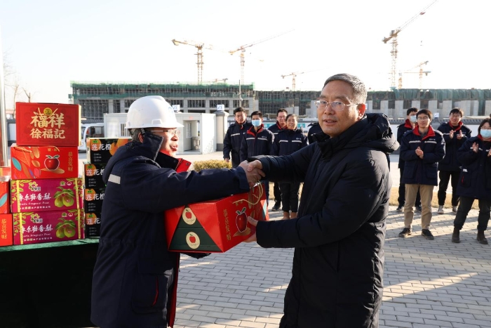 在兩個項目部,茍護生董事長都登上巡檢瞭望臺,查看施工現場全貌,對容易引發安全隱患的大型機械設備操作、高大模板支撐架安裝、疫情防控、施工人員安全防護等環節進行反復詢問、反復叮囑,強調安全工作必須以一萬的努力,防范萬一的風險。 在兩個項目部,茍護生董事長還熱情地與一線人員合影留念,并送去新春慰問品。室外寒氣襲人,但在場人員無不感到暖意融融。