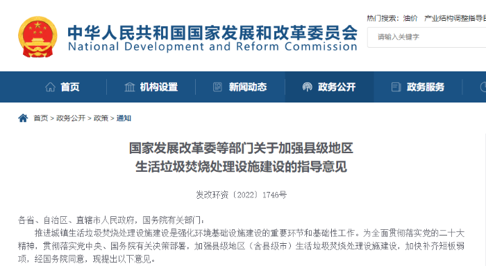 因地制宜 分類施策 有力有序補(bǔ)齊縣級地區(qū)生活垃圾焚燒處理設(shè)施短板 ——《關(guān)于加強(qiáng)縣級地區(qū)生活垃圾焚燒處理設(shè)施建設(shè)的指導(dǎo)意見》解讀 中國國際工程咨詢有限公司 張英健 楊媛媛 徐春方 推進(jìn)城鎮(zhèn)生活垃圾焚燒處理設(shè)施建設(shè)是強(qiáng)化環(huán)境基礎(chǔ)設(shè)施建設(shè)的重要環(huán)節(jié)和基礎(chǔ)性工作,是改善人居環(huán)境的重要內(nèi)容。黨中央、國務(wù)院高度重視城鎮(zhèn)環(huán)境基礎(chǔ)設(shè)施,黨的二十大報告明確提出要“提升環(huán)境基礎(chǔ)設(shè)施建設(shè)水平”。近日,經(jīng)國務(wù)院同意,國家發(fā)展改革委、住房和城鄉(xiāng)建設(shè)部、生態(tài)環(huán)境部、財政部、人民銀行等部門聯(lián)合印發(fā)《關(guān)于加強(qiáng)縣級地區(qū)生活垃圾焚燒處理設(shè)施建設(shè)的指導(dǎo)意見》(發(fā)改環(huán)資〔2022〕1746號,以下簡稱《指導(dǎo)意見》),全面系統(tǒng)提出加強(qiáng)縣級地區(qū)生活垃圾焚燒處理設(shè)施建設(shè)的指導(dǎo)思想、工作原則、主要目標(biāo)、重點(diǎn)任務(wù),指導(dǎo)各地有力有序推進(jìn)焚燒處理設(shè)施建設(shè)。《指導(dǎo)意見》作為首個聚焦縣級地區(qū)生活垃圾處理的政策文件,是貫徹落實黨的二十大精神的重要舉措,對加快補(bǔ)齊縣級地區(qū)生活垃圾焚燒處理短板、提升生活垃圾治理水平、改善人居環(huán)境具有重要意義。 01 充分認(rèn)識加強(qiáng)縣級地區(qū)生活垃圾焚燒處理設(shè)施建設(shè)的重要意義 (一)加強(qiáng)縣級地區(qū)生活垃圾焚燒處理設(shè)施建設(shè)是推進(jìn)以縣城為重要載體的城鎮(zhèn)化建設(shè)的重要途徑。縣級地區(qū)(含縣級市)是我國城鎮(zhèn)體系的重要組成部分。截至2021年底,我國縣及縣級市數(shù)量超過1860個,約為全國縣級行政區(qū)劃數(shù)量的65%、地級及以上城市市轄區(qū)數(shù)量的2倍;城區(qū)人口約2.5億人,約占全國城鎮(zhèn)常住人口的30%。生活垃圾分類和處理是城鎮(zhèn)化建設(shè)的重要內(nèi)容,今年5月,中共中央辦公廳、國務(wù)院辦公廳印發(fā)《關(guān)于推進(jìn)以縣城為重要載體的城鎮(zhèn)化建設(shè)的意見》,明確提出要建設(shè)與清運(yùn)量相適應(yīng)的垃圾焚燒設(shè)施。加強(qiáng)焚燒處理設(shè)施建設(shè),加快完善縣級地區(qū)環(huán)境基礎(chǔ)設(shè)施,對促進(jìn)新型城鎮(zhèn)化建設(shè)具有重要意義。 (二)加強(qiáng)縣級地區(qū)生活垃圾焚燒處理設(shè)施建設(shè)是提升環(huán)境基礎(chǔ)設(shè)施建設(shè)水平的重要內(nèi)容。環(huán)境基礎(chǔ)設(shè)施是基礎(chǔ)設(shè)施的重要組成部分,是深入打好污染防治攻堅戰(zhàn)、改善生態(tài)環(huán)境質(zhì)量、增進(jìn)民生福祉的基礎(chǔ)保障。黨的二十大報告對提升環(huán)境基礎(chǔ)設(shè)施建設(shè)水平作出明確要求,今年1月,國務(wù)院辦公廳轉(zhuǎn)發(fā)國家發(fā)展改革委等部門《關(guān)于加快推進(jìn)城鎮(zhèn)環(huán)境基礎(chǔ)設(shè)施建設(shè)的指導(dǎo)意見》對城鎮(zhèn)環(huán)境基礎(chǔ)設(shè)施建設(shè)作出系統(tǒng)部署。生活垃圾焚燒處理設(shè)施是環(huán)境基礎(chǔ)設(shè)施的重要組成部分,加快縣級地區(qū)生活垃圾焚燒處理設(shè)施建設(shè),為構(gòu)建系統(tǒng)完備、高效實用的環(huán)境基礎(chǔ)設(shè)施體系提供有力支撐。 (三)加強(qiáng)縣級地區(qū)生活垃圾焚燒處理設(shè)施建設(shè)是推進(jìn)城鄉(xiāng)人居環(huán)境整治的重要方式。環(huán)境基礎(chǔ)設(shè)施水平影響縣級地區(qū)人居環(huán)境和整體面貌,是縣級地區(qū)生態(tài)文明建設(shè)的重要支撐。近年來,我國生活垃圾焚燒處理方式快速發(fā)展,城市生活垃圾焚燒處理率明顯上升,但大量縣級地區(qū)生活垃圾清運(yùn)量小,不具備建設(shè)規(guī)模化垃圾焚燒處理設(shè)施的條件,生活垃圾處理以填埋為主,存在較大安全環(huán)境隱患。加強(qiáng)生活垃圾焚燒處理設(shè)施建設(shè),加快發(fā)展以焚燒為主的生活垃圾處理方式,是滿足群眾對優(yōu)美生態(tài)環(huán)境需要的重要舉措,是改善人居環(huán)境、保障人民健康的重要途徑。 02 因地制宜提出縣級地區(qū)生活垃圾焚燒處理設(shè)施建設(shè)的主要目標(biāo) 我國縣級地區(qū)數(shù)量大、類型多,經(jīng)濟(jì)社會發(fā)展水平、人口資源分布、飲食習(xí)慣、生活垃圾組分等各不相同,《指導(dǎo)意見》充分考慮縣級地區(qū)資源環(huán)境承載能力、區(qū)位條件、生活垃圾焚燒處理設(shè)施建設(shè)工作基礎(chǔ),分四類地區(qū)因地制宜提出了“到2025年,全國縣級地區(qū)基本形成與經(jīng)濟(jì)社會發(fā)展相適應(yīng)的生活垃圾分類和處理體系,京津冀及周邊、長三角、粵港澳大灣區(qū)、國家生態(tài)文明試驗區(qū)具備條件的縣級地區(qū)基本實現(xiàn)生活垃圾焚燒處理能力全覆蓋。長江經(jīng)濟(jì)帶、黃河流域、生活垃圾分類重點(diǎn)城市、‘無廢城市’建設(shè)地區(qū)以及其他地區(qū)具備條件的縣級地區(qū),應(yīng)建盡建生活垃圾焚燒處理設(shè)施。不具備建設(shè)焚燒處理設(shè)施條件的縣級地區(qū),通過