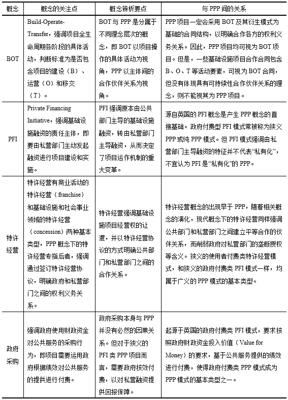 基于以上分析,將PPP與BOT、PFI、特許經(jīng)營(yíng)、政府采購(gòu)等相關(guān)概念的辨析總結(jié)如表1所示。