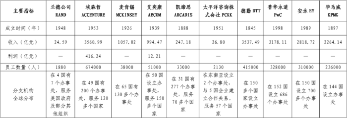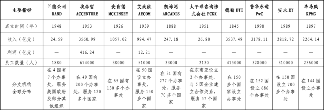 (三)研究思路 重點圍繞經營規模、全球戰略布局、集團化發展、數字化發展、人才培養等方面開展對比研究,為中咨公司打造世界一流咨詢機構提出初步的方向性戰略構想,更好地服務公司高質量發展總體戰略。充分發揮龍頭示范作用,加強精細化管理,全面提升核心競爭力,助力中咨公司加快建設成為國內有權威、國際有影響的國家高端智庫、世界一流咨詢機構,體現智庫型中央企業的使命擔當。 二、經營規模現狀分析 (一)對比企業經營規模情況 1.智庫型企業 蘭德公司(RAND)是全球頂級智庫型企業之一。蘭德公司成立于1948年,總部設在美國加利福尼亞州的圣莫尼卡,是國際最知名的非營利性的研究機構之一,被譽為現代智囊的“大腦集中營”“超級軍事學院”,致力于以嚴謹的分析研究來推進決策與政策制定。擁有來自50多個國家的1880多名員工,半數以上的研究人員持有一個或多個博士學位,在2020年全球頂級智庫綜合榜單中排名第七,2021年總收入為24.59億元(折人民幣)。 業務領域范圍較廣。蘭德公司資金來源廣泛,目前軍隊、政府的資助仍然超過一半以上。蘭德公司主要為美國軍方、美國政府機構、基金會、高校以及私營企業等提供咨詢服務,研究領域主要涉及軍事科技、國家安全、國際事務、公共安全、法律與商業、教育、健康、基礎設施、交通、能源、環境、網絡通訊、數據科學、社會公平等。 2.管理咨詢企業 埃森哲(ACCENTURE)。埃森哲成立于1953年,是一家全球領先的專業服務公司,在數字化、云計算與網絡安全領域擁有全球領先的能力。埃森哲秉承“科技融靈智,匠心承未來”的企業使命,致力于通過引領變革創造價值,為客戶、員工、股東、合作伙伴與整個社會創造美好未來。埃森哲憑借獨特的業內經驗與專業技能,以及翹楚全球的卓越技術中心和智能運營中心,為客戶提供戰略和咨詢、互動體驗、技術服務和智能運營等全方位服務,業務涵蓋40多個行業,以及企業日常運營部門的各個職能。埃森哲是《財富》全球500強企業之一,在全球49個國家設立了200多個辦事處,服務于120多個國家的客戶,擁有674000多名員工,2021年總收入為3560.99億元(折人民幣)。 麥肯錫(MCKINSEY)。麥肯錫成立于1926年,其定位是幫助領先的企業機構實現顯著、持久的經營業績改善,打造能夠吸引、培育和激勵杰出人才的優秀組織機構。主營業務是為客戶特別是企業設計、制定相配套的一體化解決方案,包括戰略開發、經營運作、組織結構等,業務范圍涉及汽車、銀行、能源、保健、保險、制造、公共事業、零售、電信和交通等領域。目前擁有來自80多個國家38000多名員工,2021年總收入為1057.02億元(折人民幣)。 德勤(DTT)。德勤成立于1845年,是全球領先的專業服務機構,世界四大會計師事務所之一。德勤品牌連續第四年被Brand Finance(品牌金融)評為全球最具影響力及最具價值商業服務品牌,入選全球最佳雇主榜單,為近90%的《財富》全球500強企業以及數千家民營企業提供專業服務。德勤業務范圍包括審計和鑒證、稅務和法律、咨詢、財務咨詢和風險咨詢服務等,涉及消費品行業、能源、資源與工業、金融服務、政府與公共服務、生命科學與醫療保健、技術、媒體與電信等領域。德勤在全球150多個國家設立辦事處,擁有415000多名員工,2021年總收入為3537.49億元(折人民幣)。 普華永道(PwC)。普華永道成立于1998年,是一家致力于“在社會中建立信任并解決重要問題”的全球專業服務聯盟組織。在中國注冊會計師協會《2021年度會計師事務所綜合評價百家排名信息》中,普華永道連續第十九年(2003年~2021年)蟬聯該項排名第一。普華永道主營業務包括戰略變革,流程優化和技術解決方案等,業務范圍涉及航空航天、國防與安全、汽車、資本項目和基礎設施、消費市場、能源、公用事業和資源、工程與建筑、金融服務、政府和公共服務、醫療、酒店與休閑、工業制造、保險、制藥與生命科學、私募股權、運輸與物流等領域。普華永道在152個國家/地區設有686個辦事處,擁有近328000多名員工,2021年總收入為3178.11億元(折人民幣)。 安永(EY)。安永成立于1989年,是全球領先的審計、咨詢、稅務、戰略與交易的專業服務機構之一,致力于幫助客戶、員工及社會各界創造長期價值,同時在資本市場建立信任。2020年全球最具價值500大品牌榜安永排名第66位,福布斯2020全球品牌價值100強安永名列第98位。安永業務范圍包括戰略與交易、咨詢、人力資源和勞動力服務、審計、稅務、法律、科技、管理服務、私人企業服務、可持續發展服務等,涉及先進制造和智慧出行、消費品和零售業、能源和資源、金融服務、政府和基礎設施、生命科學與醫療健康、私募基金、技術、媒體和電信等領域。安永在全球150個國家設立700多個辦事處,擁有310000多名員工,2021年總收入為2818.72億元(折人民幣)。 畢馬威(KPMG)。畢馬威成立于1897年,是一個由獨立的專業成員所組成的全球性組織,提供審計、稅務和咨詢等專業服務。畢馬威通過幫助其他組織降低風險和把握機遇,為客戶、員工乃至整個社會推動積極、可持續的變革。畢馬威業務范圍包括審計和鑒證、稅務和法律、咨詢、私營企業等,涉及金融服務、消費者與零售、工業制造、能源與自然資源、基礎設施、政府、醫療保健和生命科學等領域。畢馬威在全球144個國家