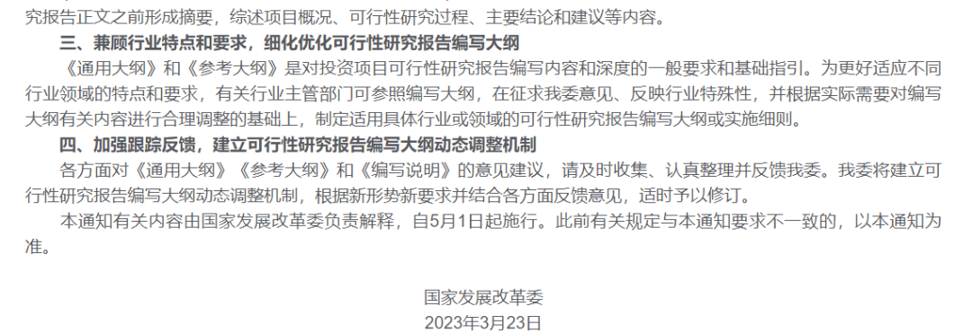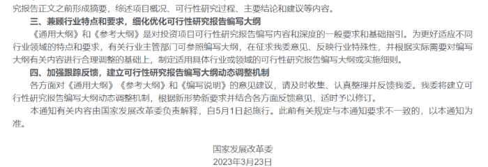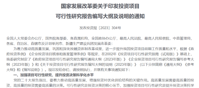 投資項目可行性研究 邁入高質量論證新階段 ——解析《投資項目可行性研究報告編寫大綱》 中國國際工程咨詢有限公司 李開孟 徐成彬 高質量發展是中國式現代化的本質要求。高質量發展需要高質量的投資,高質量的投資需要高質量的投資決策,高質量的可行性研究是確保投資科學決策的重要基礎。近日,國家發展改革委出臺《關于印發投資項目可行性研究報告編寫大綱及說明的通知》(發改投資規〔2023〕304號,點擊閱讀原文),正式發布《政府投資項目可行性研究報告編寫通用大綱(2023版)》和《企業投資項目可行性研究報告編寫參考大綱(2023版)》(簡稱《可研大綱》) ,這是繼《投資項目可行性研究指南(試用版)》(簡稱《可研指南》),時隔二十年之后國家投資主管部門發布的關于規范投資項目可行性研究報告編寫工作的新的綱領性文件,對于我國新時代投資項目科學決策、推動實現高質量投資具有里程碑意義,標志著我國投資項目可行性研究工作將邁入高質量論證的新階段。 一、《可研大綱》是投資項目可行性論證的重大飛躍 1.可行性研究伴隨改革開放納入了決策程序并逐步走向規范 可行性研究作為投資項目科學決策的一種專業工具,在世界銀行和聯合國工業發展組織等國際機構的推動下,20世紀80年代初隨著改革開放傳入我國,并成為項目投資決策的必經程序。2002年1月,國家發展計劃委員會發布《關于出版〈投資項目可行性研究指南(試用版)〉的通知》(計辦投資〔2002〕15號),同意出版發行《可研指南》?!犊裳兄改稀废到y總結了我國改革開放第一個20年可行性研究工作的經驗教訓,成為我國第一個在國家層次上用以指導投資項目可行性研究工作的規范性文本,標志著投資項目可行性研究進入規范化管理階段。 2.《可研大綱》融入了《可研指南》試用經驗并創新發展 中國國際工程咨詢公司(簡稱中咨公司)受原國家計委委托研究制定的《可研指南》,發布試用至今已有21年。20多年來,我國投融資體制和項目管理制度發生了深刻變化。《可研大綱》的研究起草工作,系統總結了《可研指南》試用20年積累的經驗,適應了投融資體制改革和行政審批制度改革等要求,并立足新發展階段,采用開放研究方式,不斷創新發展。研究起草期間,國家發展改革委投資司多次召開座談會和研討會,廣泛征求中央部委、中央企業、地方政府、金融機構、咨詢評估機構等單位的意見,并于2022年11月29日在國家發展改革委的官網向社會公開征求意見,受到了國內外廣泛關注,先后收到了有關單位正式提交的1000多條修改完善建議,通過專家集體討論和逐條消化吸收,遂成終稿。因此,《可研大綱》是集思廣益、群策群力的結果,是集體智慧的結晶。 圖1 2023年1月5日,國家發展改革委投資司主持召開《可研大綱》專家座談會 3.《可研大綱》是引領投資項目高質量決策的重要遵循 高質量發展是我國新時代經濟社會轉型發展的基本要求,同時也是我國投資項目可行性研究工作的核心價值導向。國家發展改革委本次正式印發的《可研大綱》,包括《政府投資項目可行性研究報告編制通用大綱(2023年版)》(簡稱《通用大綱》)和《企業投資項目可行性研究報告編制參考大綱(2023年版)》(簡稱《參考大綱》,不僅體現了最近20年投融資體制深化改革的重要成果,也體現了新時代高質量發展的理念要求,其推廣應用將有利于全面提升我國投資項目可行性研究的整體水平,有利于發揮可行性研究對項目投資科學決策的關鍵支撐作用,在擴大有效投資、推動投資項目高質量發展的實際工作中發揮引領作用。 二、《可研大綱》構建了統一的可行性研究邏輯框架體系 (一)《可研大綱》要求可行性研究應遵循“三大目標、七個維度”總體框架 《可研大綱》將境內各行各業千差萬別的可行性研究內容進行歸納提煉,提出了以“三大目標、七個維度”為核心的可行性研究邏輯框架體系,即投資項目可行性研究應圍繞建設必要性、方案可行性及風險可控性三大目標開展系統、專業、深入論證,重點把握“七個維度”的研究內容。其中,建設必要性應從需求可靠性維度研究得出結論,方案可行性應從要素保障性、工程可行性、運營有效性、財務合理性和影響可持續性等五個維度進行研究論證,風險可控性應通過各類風險管控方案維度研究得出結論。 作為可行性研究報告的重要組成部分,“概述”主要綜述項目和項目單位概況、編制依據、主要結論和建議等內容,便于報告閱讀者快速了解項目概貌,做出初步判斷;“研究結論和建議”主要歸納提煉項目七個維度研究的結論,做出項目是否可行的綜合判斷,并對項目需要重點關注的問題提出建議;“附表、附圖和附件”是支撐可行性研究報告正文的重要依據和關鍵證明材料。 投資項目可行性研究的邏輯關系及報告主要內容見圖2。 《可研大綱》是對可行性研究報告編寫內容和深度的一般要求,不同行業或領域的可行性研究報告應在“三大目標、七個維度”總體框架下,根據具體行業或領域及項目特點,合理設置篇章結構。 (二)建設必要性體現宏觀、中觀和微觀的需求統一 任何投資項目的提出都有其特定的背景,不應孤立地就項目論項目,從而割裂微觀投資項目與宏觀戰略、中觀層面的行業和區域發展需求之間的有機聯系。投資項目可行性研究必須基于戰