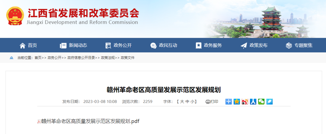 探索革命老區振興發展新路徑 ——《贛州革命老區高質量發展示范區發展規劃》解讀 田煜 董繼紅 贛州革命老區是土地革命戰爭時期中央蘇區的主體和核心區域,中華蘇維埃共和國在此奠基,中央紅軍氣壯山河的二萬五千里長征從瑞金、于都等地出發,艱苦卓絕的南方三年游擊戰爭在贛南山區浴血堅持,以毛澤東同志為代表的老一輩無產階級革命家在這里留下閃光足跡。黨中央高度關注贛州革命老區振興發展,在習近平總書記的親自關心和推動下,2012年6月,國務院出臺《關于支持贛南等原中央蘇區振興發展的若干意見》,開啟了贛南蘇區振興發展的嶄新篇章。 2021年1月,國務院出臺《關于新時代支持革命老區振興發展的意見》,提出研究支持贛州、三明等城市建設革命老區高質量發展示范區。2022年3月,國務院批復同意《贛州革命老區高質量發展示范區建設方案》。近期,經江西省人民政府同意,《贛州革命老區高質量發展示范區發展規劃》(以下簡稱《規劃》)正式印發。《規劃》明確了示范區建設的戰略目標、重點任務和支持政策,為贛州在全國革命老區高質量發展上作示范、勇爭先繪就了“路線圖”“施工圖”。 01 《規劃》為贛南蘇區振興發展指明了新發展階段的行動目標 黨的十八大以來,在黨中央堅強領導和關心關懷下,在中央國家機關及有關單位的鼎力支持下,贛州經濟社會發展取得歷史性成就。經過十年振興發展,經濟實力大步跨越,2012-2021年,贛州市地區生產總值從1700億元增至3658億元,年均增速9.2%,高于同期全國、全省水平2.5、0.5個百分點,人均GDP與全國平均水平的差距縮小了10.8個百分點;特色產業揚優成勢,營商環境持續優化,2022年,實際利用外資3.73億美元、進出口總額1033.1億元,在全國革命老區重點城市中位居前列。生態屏障持續筑牢,水土保持生態治理“贛州模式”、山水林田湖草沙綜合治理“尋烏經驗”在全國推廣。贛州人民堅定執著聽黨話、感黨恩、跟黨走,紅色基因薪火相傳,煥發新的時代榮光。 立足新階段,《規劃》錨定2035年與全國同步基本實現社會主義現代化的遠景目標,綜合考慮贛州市發展條件和外部環境,緊密銜接“十四五”規劃綱要及各領域專項規劃,在綜合實力、產業發展、鄉村振興、生態文明、改革開放、共同富裕、紅色傳承7個方面設置了36項主要指標。指標選取緊扣“6個區”戰略定位和“十四五”階段性任務,突出代表性,同時有利于考核監測任務的落實情況。在確定經濟增長目標時,《規劃》對標“十四五”規劃綱要,同時結合2020-2022年贛州市實際經濟增長情況,提出了到2025年GDP突破5500億元的預期目標。在設置反映產業發展的相關指標時,《規劃》充分對接經濟高質量發展內涵,納入數字經濟、科技創新等反映質量效益的指標,體現了贛州革命老區堅定不移強化科技創新,著力提升產業層次的勇氣和決心。 資料來源:《贛州革命老區高質量發展示范區發展規劃》 02 《規劃》聚焦新發展理念因地制宜謀劃了作示范的六大領域 立足新起點,奮進新征程,贛州堅持在推進中國式現代化的偉大進程中,探索革命老區振興發展新路徑。《規劃》圍繞“六個作示范”領域,細化、實化了構建現代產業體系、全面推進鄉村振興、建設美麗中國“贛州樣板”、堅持深化改革開放、健全公共服務體系、賡續紅色血脈六個方面的重點任務。 (一)構建現代產業體系,推進產業創新發展先行示范。習近平總書記指出,要堅持面向世界科技前沿、面向經濟主戰場、面向國家重大需求、面向人民生命健康,加快實現高水平科技自立自強。近年來,贛州革命老區堅定不移走集群發展、創新發展、融合發展道路,加快培育特色優勢產業集群,現代家居產業從百億“草根經濟”躍升為2500億元的產業集群,稀土鎢新型功能材料產業集群獲批全國首批戰略性新興產業集群,中科院贛江創新研究院、中國稀土集團落戶贛州,填補了江西無國家級大院大所和央企總部的空白。為加快推動贛州革命老區開辟經濟發展的新領域新賽道、塑造發展新動能新優勢,《規劃》部署了區域性科技創新中心、壯大更具影響力的現代產業集群、做優做強數字經濟等3大重點任務。重點提出高質量推進中科院贛江創新研究院建設,支持贛州高新區創建國家自主創新示范區、雙創示范基地,支持贛州創建國家新型工業化產業示范基地、國家級工業設計中心,推進贛深數字經濟走廊建設,支持贛州建設國際互聯網數據專用通道等舉措。 中國稀土集團已在贛州掛牌成立。(于垚峰 攝) (二)深入實施鄉村振興戰略,推進城鄉協調發展先行示范。習近平總書記指出,全面推進鄉村振興是“三農”工作重心的歷史性轉移。10年來,贛州革命老區推動域內11個貧困縣全部脫貧摘帽,114.33萬農村建檔立卡貧困人口全部脫貧,改造農村危舊房土坯房69.52萬戶,解決農村安全飲水近300萬人,新建改造農村公路2.7萬公里,農民人均可支配收入增幅連續9年領跑全省、增長2.1倍,贛南臍橙品牌價值連續六年穩居全國水果類第一,贛南茶油晉級地理標志產品區域品牌榜50強。然而受歷史、區位等因素影響,贛州革命老區發展不平衡不充分的問題仍然突出,脫貧摘帽不是終點,而是新生活、新奮斗的起點。圍繞鄉村振興和新型城鎮化雙輪驅動,加快建設革命老區鄉村振興示范區,《規劃》部署了鞏固拓展脫貧攻