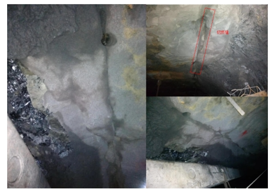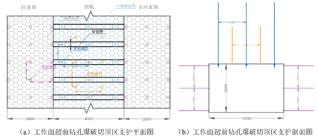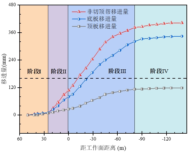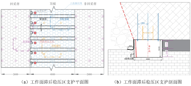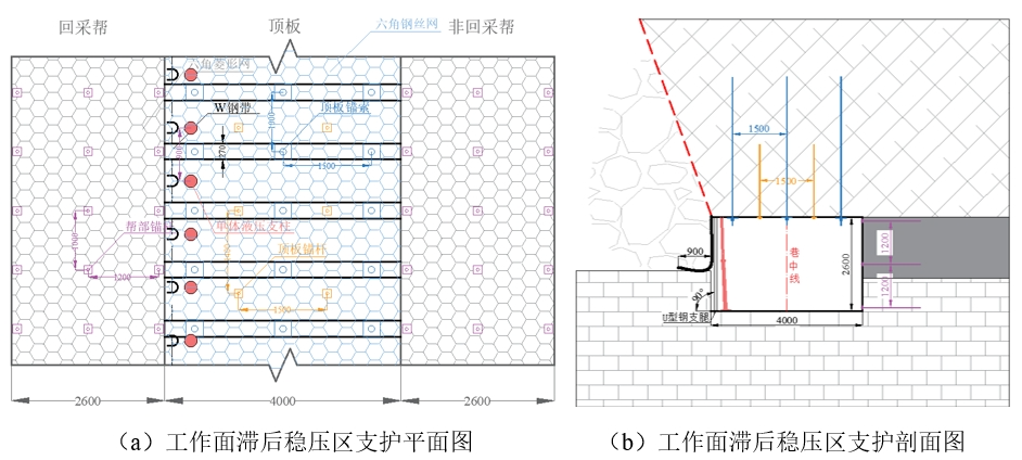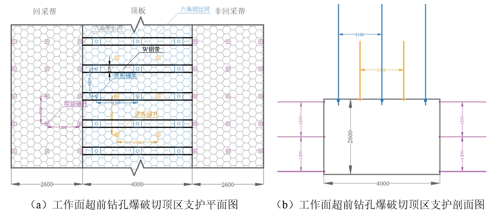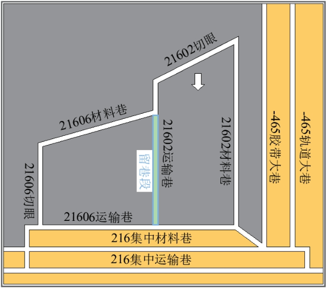 薄煤層開采沿空留巷關(guān)鍵技術(shù)研究 趙法森 吳城樂 林科文 劉飛翔 摘 要:為了確定堅硬頂板下薄煤層沿空留巷切頂鉆孔爆破參數(shù)及圍巖控制方案,以山東某礦21602工作面運輸巷為工程背景,運用理論分析、數(shù)值模擬及現(xiàn)場實測的手段進行了研究。論文將沿空留巷劃分為三個階段,并基于計算結(jié)果給出了相應(yīng)的巷道圍巖支護方案。現(xiàn)場應(yīng)用結(jié)果表明:合理的鉆孔爆破高度為4.5m,切頂角度為70°;現(xiàn)場實施爆破后,留巷穩(wěn)定后頂板累計變形量為118mm,底板累計變形量為344mm,實體煤側(cè)累計變形量為402mm,能滿足留巷后期使用要求。相關(guān)研究成果已在21602工作面進行了現(xiàn)場應(yīng)用,為同等條件下實施沿空留巷提供了借鑒。 關(guān)鍵詞:切頂留巷;薄煤層;堅硬頂板;巷道圍巖控制 傳統(tǒng)的留設(shè)煤柱開采方式不僅在經(jīng)濟方面不占任何優(yōu)勢,還造成大量煤炭資源浪費,由于所留設(shè)的煤柱往往出現(xiàn)應(yīng)力集中現(xiàn)象,引起巷道圍巖變形破壞,不利于巷道的維護使用[1-4]。因此,沿空留巷技術(shù)是解決上述問題的主要方式之一。沿空留巷取消了煤柱,提高了礦井的回采率[5-8],延長了礦井的服務(wù)年限,大幅度降低掘進率,緩解采掘接替矛盾。相關(guān)數(shù)據(jù)表明,沿空留巷可提高煤炭回收率10%以上,巷道掘進率可降低30%左右,明顯改善采掘接續(xù)關(guān)系[9-10]。切頂卸壓沿空留巷技術(shù)具有工藝簡單、性價比高、留巷速度快的優(yōu)點,尤其對堅硬頂板下沿空留巷具有明顯的優(yōu)越性[11]。 山東某礦主采平均厚度為1.35m的16#煤層,其直接頂為普氏系數(shù)大于8、平均厚度4.6m的堅硬灰?guī)r。為盡可能回收堅硬煤層下薄煤層的煤炭資源并緩解采掘接續(xù)緊張問題,采用爆破切頂沿空留巷技術(shù)來提高煤炭資源的回收率。以21602工作面運輸巷為工程背景,采用數(shù)值模擬以及現(xiàn)場監(jiān)測相結(jié)合的研究手段,確定了爆破切頂、巷道圍巖穩(wěn)定性控制等關(guān)鍵技術(shù)參數(shù)并在現(xiàn)場進行了成功應(yīng)用。 一、工程概況 山東某礦21602工作面主采16#煤層,煤層平均厚度為1.35m,平均傾角為4°,平均埋深535m。該工作面走向長度為233m,傾斜長度為200m,采用綜合機械化開采。煤層及頂?shù)装鍘r性詳細情況見表1,直接頂和基本頂為堅硬灰?guī)r,厚度3.5-5.8m,硬度系數(shù)f=8~10。 表1 21602工作面主要圍巖情況 為緩解工作面采掘接替緊張,對21602工作面運輸巷部分區(qū)段進行沿空留巷作業(yè),將其作為21606工作面材料巷,沿空留巷區(qū)段如圖1所示。運輸巷沿煤層頂板掘進,為半煤巖巷道,巷道斷面為矩形,凈高4m,凈寬2.6m。 圖1 工作面布置平面圖 工作面超前未切頂區(qū),巷道頂板穩(wěn)定性良好,根據(jù)工作面以往巷道實際來壓情況及支護設(shè)計[12-13],確定21602運輸巷工作面超前未切頂區(qū)巷道支護形式為“錨桿+六角菱形網(wǎng)”支護方式。其具體支護參數(shù)為:頂部錨桿為兩排螺紋錨桿,規(guī)格為φ20×2000mm,頂板錨桿間排距為:1400×1500mm;幫部錨桿為金屬螺紋錨桿,規(guī)格為φ16×1600mm,幫部錨桿間排距為:1000×1200mm,并掛六角菱形網(wǎng)支護;錨桿托盤規(guī)格為:100×100×10mm。 二、21602工作面運輸巷切頂留巷關(guān)鍵技術(shù)參數(shù)確定 (一)理論分析 1.切頂高度計算 在無煤柱沿空留巷過程中,巷道圍巖的穩(wěn)定受到多種因素的綜合影響,其中切頂高度對沿空留巷的礦壓顯現(xiàn)具有非常顯著的影響[14-15]。切頂高度應(yīng)綜合考慮上覆堅硬頂板的結(jié)構(gòu)與高位巖層的破斷運移特征,保證難垮落頂板在采動應(yīng)力作用下順利沿切頂弱面切落。切頂高度的計算過程具體如下[16]: 假設(shè)切頂高度范圍內(nèi)有i層巖層,巖層編號自下向上依次為1、2、…、i,則: 式(1)可表示為: 已知: 則有: 式中,hq為切頂高度,m;H1…Hj為1…j層頂板巖層厚度(Hj為第j層頂板巖層厚度),m;M為采高,取1.35m;k1…ki 為1…i層頂板巖層碎脹系數(shù)(ki為第i層頂板巖層碎脹系數(shù));kp為加權(quán)平均碎脹系數(shù),取1.3~1.4;代入式(4),可得最合適的切頂高度應(yīng)為3.4~4.5m。 2.切頂角度分析 將切頂角度α定義為切頂與水平方向的夾角,切頂角度的大小對沿空留巷的圍巖穩(wěn)定和頂板下沉量的控制有一定的影響,切頂與水平方向角度越小( ),側(cè)向懸臂附加應(yīng)力越大,同時斷裂面下采空區(qū)的充填效果差,巷道頂板易出現(xiàn)較大旋轉(zhuǎn)變形;切頂與水平方向角度越大( ),會對爆破線附近的錨桿索產(chǎn)生擾動破壞,不利于巷道穩(wěn)定[17]。因此,最合適的切頂角度應(yīng)在70°至90°之間。 (二)數(shù)值模擬及參數(shù)選擇 1.模型構(gòu)建 本模型以21602工作面地質(zhì)生產(chǎn)條件為背景,建立沿空留巷FLAC3D數(shù)值計算模型。模型尺寸為長×寬×高=200m×140m×62.6m,模型四周約束水平位移,底部約束水平和垂直位移,頂部施加均布載荷。載荷的大小為模型頂部巖層的重量,100m深巖石自重取2.6MPa,施加均布載荷的大小為12.3MPa,模型單元采用Mohr-Coulomb本構(gòu)模型,各巖層厚度及基本物理力學參數(shù)見表2。模擬巷道開挖尺寸為200m×4m×2.6m,工作面開挖尺寸為50m×80m×1.35m,在模型中需要切頂?shù)膮^(qū)域賦予空模型,以達到模擬中的切頂效果。待工作面開采后,