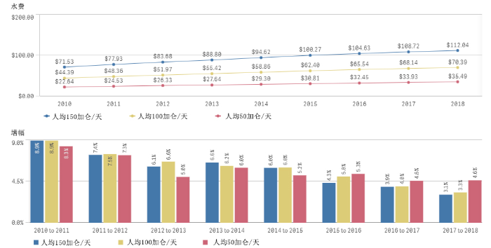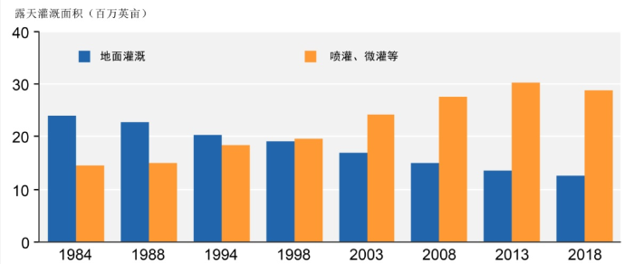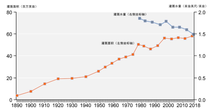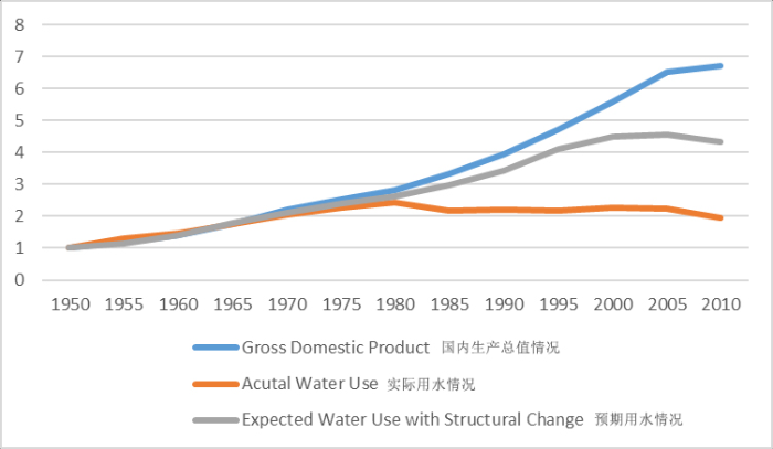 編者按:《2021年聯(lián)合國世界水發(fā)展報告》提出,全球新水使用量在過去100年中增加了6倍,自20世紀80年代以來以每年約1%的速度增加。預計至2050年全球用水量仍將以類似的速度繼續(xù)增長,且增長主要集中在中低收入國家,尤其是新興經(jīng)濟體[1]。 為進一步把握好我國水資源未來需求趨勢,我們深入分析研究了一些典型國家的用水態(tài)勢變化情況及水資源管理經(jīng)驗,以期為我國做好水資源需求研判以及科學指導水工程規(guī)劃建設(shè)提供參考。本公眾號將研究成果以系列文章的方式陸續(xù)刊發(fā),本文為系列研究之一,供業(yè)界同仁參考。 美國用水變化態(tài)勢對我國的啟示 姜富華 邢智慧 紀興華 一、1950年以來美國用水量變化態(tài)勢分析 (一)1950年以來美國用水量變化情況 2015年美國總用水量約為4449億立方米,其中淡水約為3883億立方米,占比為87%;咸水約為566億立方米,占比為13%。 從1950年至2015年間美國總用水量的變化情況看,其總體呈先增后降的態(tài)勢(見圖1)。以1980年為轉(zhuǎn)折點,1950-1980年間美國總用水量隨著人口和經(jīng)濟的增長持續(xù)增長,1980年美國總用水量約為1950年的2.4倍;1980年以后,受產(chǎn)業(yè)結(jié)構(gòu)調(diào)整、技術(shù)進步、用水效率提高等因素綜合影響,美國總用水量呈現(xiàn)了總體下降的態(tài)勢,2015年總用水量比用水高峰的1980年減少了約25%。 美國淡水取用量與總用水量變化態(tài)勢一致(見圖2)。1980-2015年間美國淡水總用水量下降了27%,此期間美國人口增長了約42%,GDP增長了5倍以上[2]。 數(shù)據(jù)來源:美國地質(zhì)調(diào)查局統(tǒng)計。 注:①不同時段取水量統(tǒng)計口徑略有差異;②取水量等于毛用水量。 圖1 1950-2015年美國總?cè)∮盟考胺诸惾∮盟孔兓瘧B(tài)勢 數(shù)據(jù)來源:美國地質(zhì)調(diào)查局統(tǒng)計。 圖2 1950-2015年美國淡水取用水量與人口變化態(tài)勢 有研究[3]繪制了以1950年為基準,至2010年美國GDP與用水量間的關(guān)系變化情況圖(見圖3)。藍色線為實際GDP變化,橙色線為實際用水量變化,灰色線為考慮產(chǎn)業(yè)結(jié)構(gòu)變化、不考慮技術(shù)改進情況下的預測用水變化。藍色線與橙色線的剪刀走向表明:早在1980年,美國用水量已與GDP脫鉤。藍色線與灰色線、灰色線與橙色線的剪刀走向表明:導致脫鉤的重要因素是用水效率提升和經(jīng)濟結(jié)構(gòu)變化。 數(shù)據(jù)來源:數(shù)據(jù)來自[3];1950=1 圖3 1950-2010年美國總用水量與經(jīng)濟變化關(guān)系分析 (二)主要行業(yè)用水量變化情況 美國用水類別中,熱電、灌溉、公共和自供工業(yè)用水量是排在前4名的用水戶,其用水總量占美國總用水量的比重超過90%,見圖4。本文重點分析多年來美國熱電、灌溉、公共和自供工業(yè)用水的變化情況。 數(shù)據(jù)來源:美國地質(zhì)調(diào)查局。 圖4 2015年美國分類取用水量統(tǒng)計 1.熱電用水變化態(tài)勢 熱電是美國最大的用水對象。2015年美國熱電用水量約為1838億立方米,占總用水量的41%左右,見圖5。美國熱電用水基本來自地表水,且以淡水為主。2015年美國熱電用水量比2010年降低18%左右,用水效率由2010年的71.9升/千瓦時降低到2015年的56.8升/千瓦時。 數(shù)據(jù)來源:美國地質(zhì)調(diào)查局。 圖5 1950-2015年美國熱電用水量變化態(tài)勢 2.灌溉用水變化態(tài)勢 美國灌溉用水量占總用水量的40%左右,僅次于熱電用水。2015年美國灌溉面積超過3.5億畝,其中噴灌、微灌面積比重分別為55%和8.6%左右,灌溉總用水量約為1630億立方米(占總用水量的37%左右),地表和地下水源灌溉供水比重分別為52%和48%。由于降雨豐枯變化,美國灌溉水量年際間有波動,但從大的變化趨勢看,1980年以來總體呈下降趨勢,2015年灌溉水量比1980年減少了21%,見圖6。 數(shù)據(jù)來源:美國地質(zhì)調(diào)查局。 圖6 1950-2015年美國灌溉用水量變化態(tài)勢 灌溉用水受水資源條件、灌溉面積、種植結(jié)構(gòu)、灌溉設(shè)施、灌溉效率等多種因素影響。據(jù)美國農(nóng)業(yè)部統(tǒng)計,美國灌溉面積快速增長,從1890年的不足1821萬畝增長到2017年的3.52億畝左右,見圖7。但與此同時,實際灌溉用水強度有所下降,1969-2017年單位面積平均灌溉水量從406立方米/畝下降至304立方米/畝,這是農(nóng)業(yè)種植模式調(diào)整、灌溉設(shè)施與技術(shù)采用和灌溉效率提高等綜合作用的結(jié)果。 數(shù)據(jù)來源:美國農(nóng)業(yè)部。 圖7 1890-2018年美國灌溉面積和單位面積灌溉用水量變化態(tài)勢 美國灌溉用水結(jié)構(gòu)不斷變化,主要表現(xiàn)為玉米和大豆的灌溉面積顯著增加。1964年美國主要灌溉農(nóng)作物是棉花和牧草,玉米和大豆加起來不到1518萬畝。2017年玉米灌溉面積超過7284萬畝,大豆灌溉面積超過5463萬畝,見圖8。 數(shù)據(jù)來源:美國農(nóng)業(yè)部。 圖8 1964-2017年美國主要農(nóng)作物灌溉面積變化態(tài)勢 同時,美國越來越注重高效節(jié)水灌溉技術(shù)的運用。美國農(nóng)業(yè)灌溉主要集中在西部17州。1984年美國西部17州露天灌溉農(nóng)田中使用高效節(jié)水灌溉系統(tǒng)的比重為37%,2018年該比例提高至72%,見圖9。 數(shù)據(jù)來源:美國農(nóng)業(yè)部。 圖9 1984-2018年美國西部17州露天農(nóng)田灌溉模式變化態(tài)勢 3.公共用水量變化