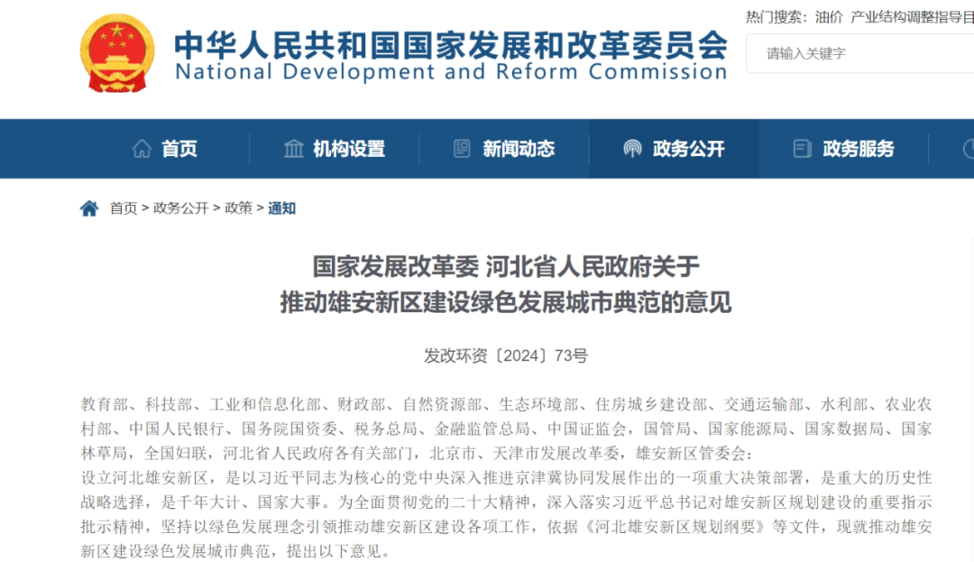 千年大計綠色為本 打造綠色發展新高地和城市建設新標桿 ——《關于推動雄安新區建設綠色發展城市典范的意見》解讀 張英健 木其堅 近日,國家發展改革委、河北省人民政府聯合印發《關于推動雄安新區建設綠色發展城市典范的意見》(發改環資〔2024〕73號,以下簡稱《意見》)?!兑庖姟飞钊胴瀼芈鋵嵙暯娇倳泴π郯残聟^規劃建設的重要指示批示精神,堅持以綠色發展理念引領推動雄安新區建設各項工作,為雄安新區綠色高質量發展明確了方向路徑,也為全國綠色高質量發展提供了生動實踐和鮮活樣本,具有非常重要的意義。 一、綠色是建設雄安新區的鮮明底色 河北雄安新區的設立,是千年大計、國家大事。習近平總書記從謀劃選址到規劃建設,親自決策、親自部署、親自推動,傾注大量心血,為雄安新區規劃建設領航指路、把脈定向。從謀劃設立之初,習近平總書記就強調要堅持生態優先、綠色發展,劃定開發邊界和生態紅線,實現兩線合一,著力建設綠色、森林、智慧、水城一體的新區。2017年,雄安新區在規劃階段即圍繞綠色發展專門設置了綠色生態發展指標體系、清潔能源利用、資源環境承載力、大氣環境綜合治理、綠色建筑標準等10余項專題,這充分體現了雄安新區在規劃之初就厚植了“綠色基因”。2023年,習近平總書記主持召開高標準高質量推進雄安新區建設座談會并發表重要講話,強調要貫徹綠水青山就是金山銀山的理念,堅持綠色化、低碳化發展,把雄安新區建設成為綠色發展城市典范。 《意見》深入貫徹習近平總書記這一重要指示要求,提出要充分發揮雄安新區平地建新城的優勢,強化頂層設計,注重統籌協調,高標準高質量推進雄安新區城市建設與生態文明建設,積極穩妥推進碳達峰碳中和,加快形成雄安新區綠色低碳發展的空間格局、產業結構、生產方式、生活方式,持續鞏固生態環境治理成效,全面提升生態安全和綠色發展水平,建設人與自然和諧共生的綠色發展城市典范,樹立新時代美麗中國雄安樣板。應當說,《意見》繪制了一幅綠色雄安、美麗雄安畫卷。 二、分階段繪就綠色發展城市典范建設藍圖 雄安新區肩負著打造高質量發展全國樣板的歷史重任。雄安新區圍繞高水平社會主義現代化城市建設目標,堅持把綠色作為城市建設的底色,完善生態功能,拓展藍綠空間,推廣低碳模式,建設數字城市,打造新時代綠色發展新標桿。短短6年里,雄安新區從無到有、從藍圖到實景,一座高水平現代化城市正在拔地而起,堪稱奇跡。一系列設計之初的綠色設想也正在變為現實,如雄安自貿試驗區交流展示中心等充分利用建筑光伏一體化和地源熱泵技術,實現建筑電力能源的自給自足,一批高品質的綠色學校、綠色醫院、綠色辦公、綠色住宅、綠色工業建筑等示范場景在近幾年也都逐步成型。下一階段,高標準高水平建設雄安新區,也必須要牢牢把握黨中央關于雄安新區的功能定位、使命任務和原則要求,提高政治站位,保持歷史耐心,處理好近期目標和中遠期目標、城市建設速度和人口聚集規模、產業轉移和產業升級、政府和市場、承接北京非首都功能疏解和城市自身發展、城市建設和周邊鄉村振興等重大關系,確保雄安新區建設和發展的正確方向。 《意見》堅持把綠色作為高質量發展的普遍形態,堅持生態優先、綠色發展,科學提出了雄安新區建設綠色發展城市典范近、中、遠期建設目標。近期目標注重夯實雄安新區綠色發展基礎。這一時期的工作重點主要是生態空間格局的構建,到2030年“一淀、三帶、九片、多廊”的生態空間格局將初步構建,城淀共生共榮的風貌基本形成。中期目標更加注重綠色軟實力的構建。這一時期聚焦綠色產業、環境質量、生態宜居的全面提升,到2035年城市綠化、環境質量、藍綠空間都得到根本改善和顯著提升,綠色低碳現代產業格局初步確立,能效、碳排放等指標達到國內領先水平,成為綠色發展新高地和城市建設新標桿。遠期目標旨在把雄安新區全面建成高質量高水平的社會主義現代化城市。屆時雄安將成為京津冀世界級城市群的重要組成部分,各項綠色生態類指標達到國際領先水平,環境優美生態宜居成為雄安新區顯著標識,為綠色高質量發展樹立全國樣板。 三、全方位打造綠色發展城市典范 《意見》明確了建設綠色發展城市典范的重要內容、實現路徑和重點任務,樹立9個典范,打造綠色高質量發展樣板。生態空間方面,強調打造藍綠交織、清新明亮的城市生態空間,塑造綠色低碳、健康舒適的宜居生活環境,樹立宜居宜業城市典范。現代產業方面,強調構建綠色低碳產業體系,推行綠色低碳循環生產方式,樹立綠色經濟城市典范。能源方面,大力發展綠色能源,構建新型電力系統,打造低碳安全能源體系,樹立綠色能源城市典范。交通方面,健全綠色交通網絡設施,提升綠色交通管理水平,構建低碳智能交通網絡,樹立綠色交通城市典范。建筑方面,全面推進建筑綠色低碳發展,推廣綠色建造方式,強化建筑運行節能降碳管理,提升建筑領域節能降碳水平,樹立綠色建筑城市典范。環境治理方面,持續推進白洋淀生態修復,健全完善環境基礎設施,持續推進環境綜合治理,提升環境保護治理成效,樹立優美環境城市典范。綠色文化方面,強化生態文明宣傳教育,倡導綠色低碳生活方式,強化生態文明意識培養,樹立
