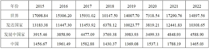 表1 世界、發(fā)展中國家、中國的境外直接投資流量(2015-2021) (單位:億美元)