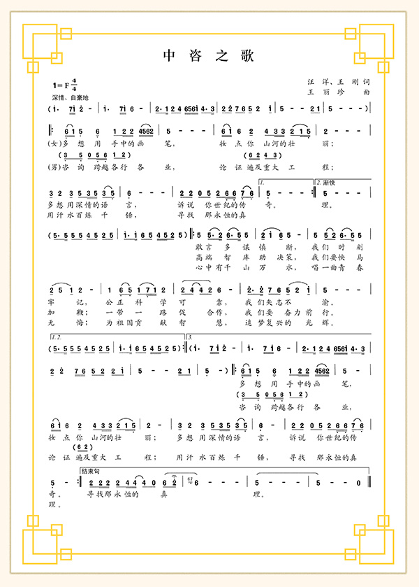 《朝陽》是一首青年人的歌曲,曲風為進行曲,堅定豪邁、有力、朝氣蓬勃,體現了新一代中咨青年牢記囑托、砥礪前行,忠于理想、不斷進取的精神風貌,以堅定的理想信念,勇立時代潮頭;以過硬的業務本領,挑起時代重擔;以飽滿的工作熱情,甘做時代激流。此曲被《中國曲譜網》登錄,此次創作是我公司為職工歌曲創作的一次展示,展現了廣大職工開拓創新、愛崗敬業、爭創一流的精神豐貌。